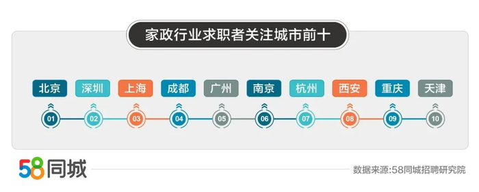 从求职端上来看,10月份家政行业求职者关注城市前十分别为:北京、深圳、上海、成都、广州、南京、杭州、西安、重庆、天津。在投递活跃城市中,北京、成都、西安、重庆同比增长明显,增幅分别为29.49%、22.83%、21.55%、20.14%,均超过了20%。