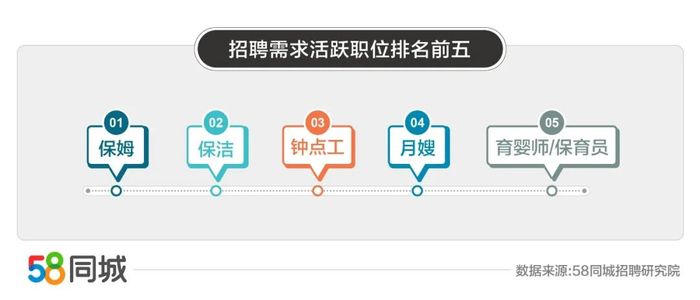 根据58同城招聘研究院大数据显示,2021年10月,家政行业典型职位中,招聘活跃度较高的职位有保姆、保洁、钟点工、月嫂、育婴师/保育员、护工。同时求职活跃度较高的职位依次为保洁、保姆、护工、育婴师/保育员、月嫂、钟点工。可见,保姆、保洁在供需两端均有较高需求。十月是传统的招聘高峰期,面对市场对保姆、保洁的日益增长的用工需求,从业者也对该行业产生了较高的求职热情。