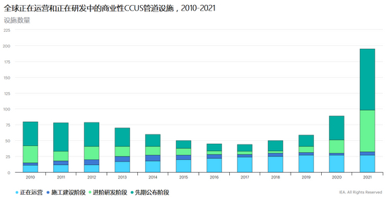 2021年1月至今,已公布的CCUS设施建设计划超过了100个,全球管道工程项目的推进也有望让二氧化碳捕集能力翻两番。