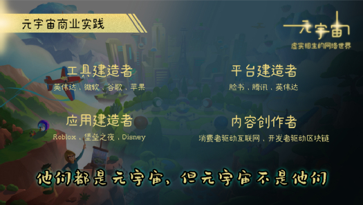 就像大家谈到的ROBLOX,堡垒之夜,包括前不久迪士尼宣布,要建设一个元宇宙世界,这些都是应用建造者。ROBLOX是元宇宙,但是元宇宙不是ROBLOX,迪士尼是元宇宙,但元宇宙不是迪士尼,它们都是其中一个参与者。