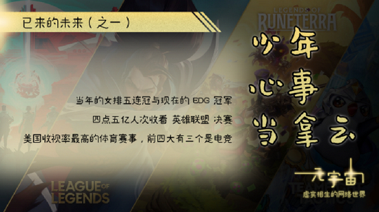 这就是时代,这就是未来。年轻人喜欢的东西和过去不一样了。他们喜欢电子化的、虚拟的、数字化的竞技,喜欢虚拟世界里面的赢和输。