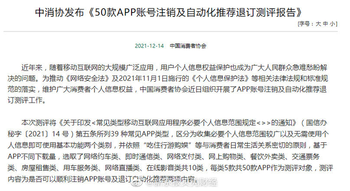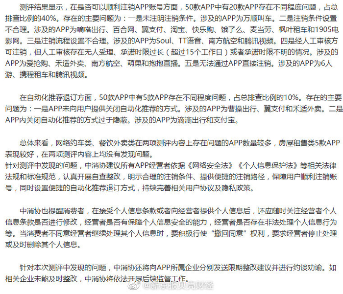 #50款APP账号注销及自动化推荐退订测评报告#【中消协:#20款APP存在注销账号问题#,#5款APP自动化推荐退订存在问题#】中国消费者协会今天(14日)发布《50款APP账号注销及自动化推荐退订测评报告》显示,在是否可以顺利注销APP账号方面,50款APP中有20款APP存在不同程度问题,占总排查比例的40%。存在的主要问题为:一是未注明注销条件。涉及的APP为万顺叫车。二是注销条件设置不合理。涉及的APP为嘀嗒出行、百合网、翼支付、淘宝、快乐购、饿了么、麦当劳、枫叶租车和1905电影网。三是注销流程设置不合理。涉及的APP为Soul、TT语音、南方航空和腾讯视频。四是经人工审核方可注销,但人工审核存在无人受理、承诺时限过长(超过15个工作日)或者承诺时限不明的情况。涉及的APP为爱抢购、禾适外卖、南方航空、萌果和抱抱直播。五是无法通过APP直接注销。涉及的APP为6人游、携程租车和腾讯视频。