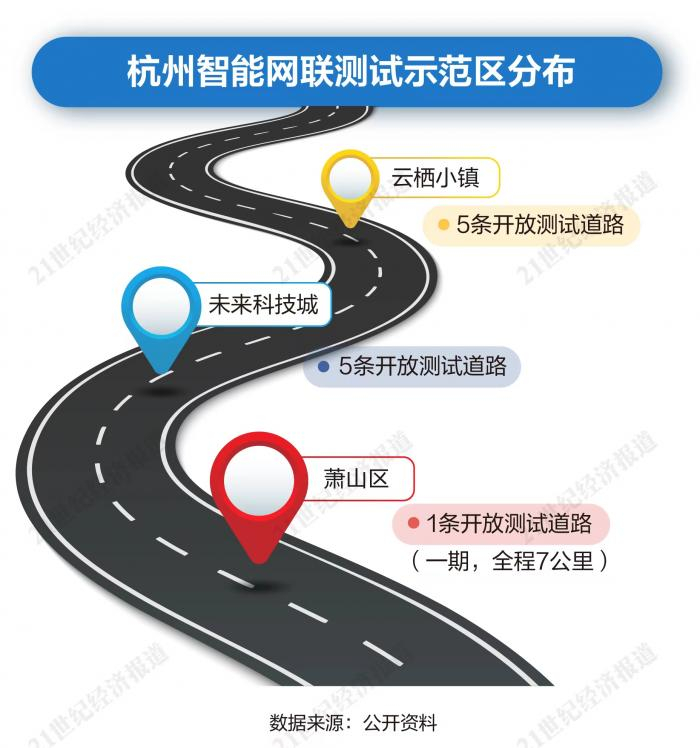 在智能网联汽车的测试示范应用方面,杭州也有明显的进展。目前,杭州云栖小镇已成功申请为国家级智能网联示范区,开放5条开放测试道路,阿里巴巴、飞步科技、零跑汽车等6家公司获得智能网联汽车道路测试牌照。此外,位于余杭区的未来科技城也开放了5条开放测试道路,不过测试时间和许可环境有限制,萧山区则有一个5G智能网联车路协同系统项目,据称是全国首个在社会开放路段实施并面向商业应用的车路协同项目,一期覆盖了7公里的路段,涉及7个路口、2个公交站台的智能化改造,并应用于智能网联公交车和智能驾驶物流车。