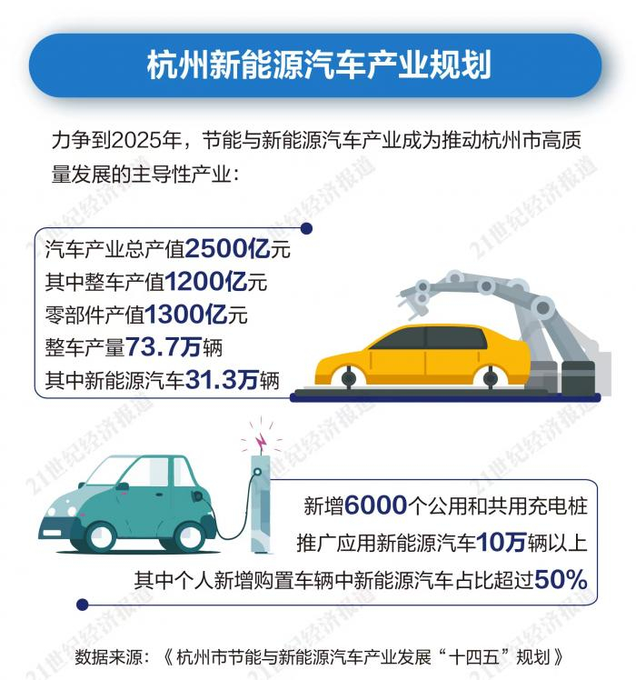 2021年7月,杭州市经济和信息化局与杭州市发展和改革委员会联合发布《杭州市节能与新能源汽车产业发展“十四五”规划》,规划提出,杭州要在2025年力争将节能与新能源汽车产业发展成为推动杭州市高质量发展的主导性产业:实现汽车产业总产值2500亿元,其中整车、零部件产值分别为1200亿元、1300亿元;实现整车产量73.7万辆,其中新能源汽车31.3万辆。
