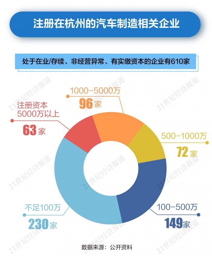 如果这组数据不够具象的话,21世纪经济报道记者也从另一个维度进行了统计:注册在杭州的、处于在业/存续、非经营异常、有实缴资本的业务涵盖汽车制造的企业共有610家,其中,注册资本超过5000万的有63家,与之对比,同为省会城市、汽车产量规模也不算太大的南京市,上述两个数字分别为1884家、239家。