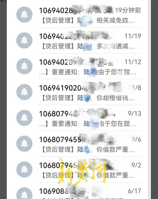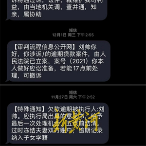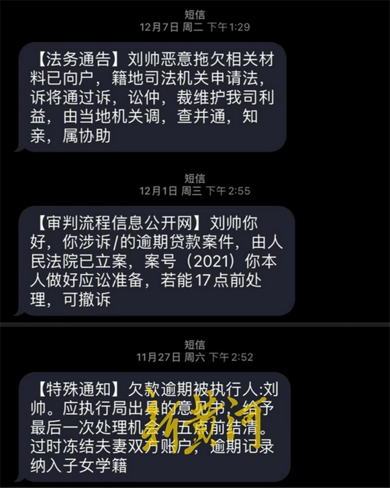 桑先生说,他曾多次苦口婆心地告诉来电者,自己不是刘帅的父亲,希望对方能在后台备注下,不要再骚扰自己,但催债的电话依旧源源不断。“变着花的打,嘴皮子都说破了也没用,短信也没断过。”根据桑先生提供的截图可以看到,从11月至今,他还收到了多条因刘帅逾期偿还贷款被通报起诉的消息。“这样的行为难道不是恶意催债吗?况且我真的与这位刘帅素不相识。”
