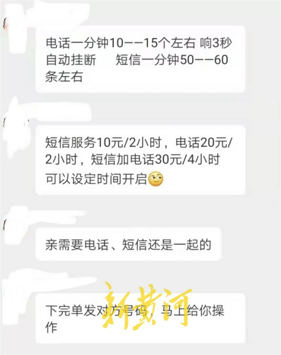 新黄河记者了解到,客户若有特殊需要,商家还能提供包月服务。“包月短信轰炸128元,电话轰炸158元,短信、电话双轰炸188元。”商家表示,操作步骤简单,下单后客服会提供一个微信号。添加好友后,发送网页链接和操作教程,登录账号后可直接上手操作。
