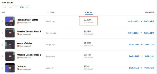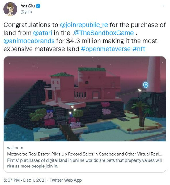 11月30日,The Sandbox中一块虚拟土地以约430万美元的价格售出,折合人民币约2730万元,买家是一家名为Republic Realm的元宇宙投资公司。