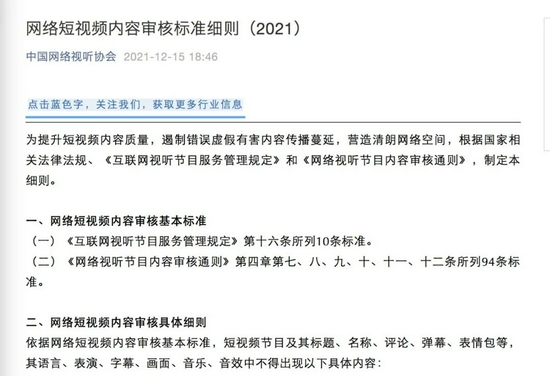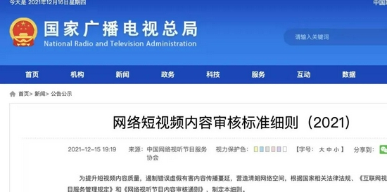 12月15日晚,国家广播电视总局官网也发布了《网络短视频内容审核标准细则(2021)》。