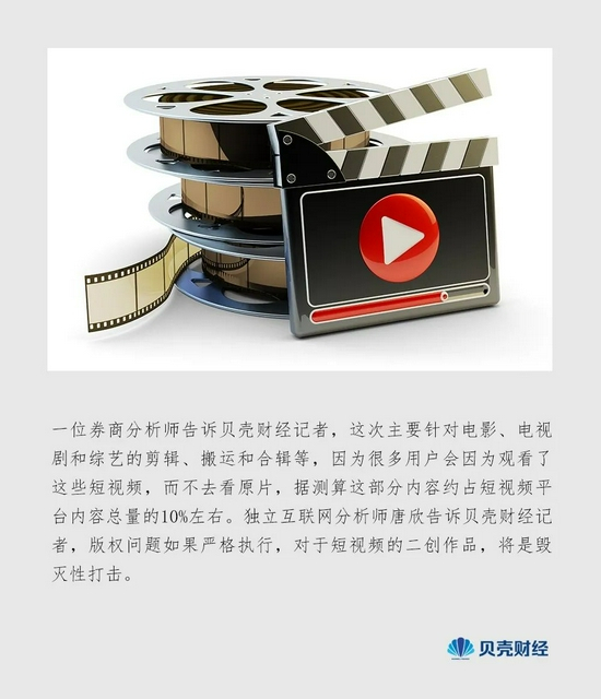 一位券商分析师告诉贝壳财经记者,这次主要针对电影、电视剧和综艺的剪辑、搬运和合辑等,因为很多用户会因为观看了这些短视频,而不去看原片,据测算这部分内容约占短视频平台内容总量的10%左右。