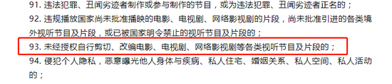 具体而言,第92条规定,不得违规播放国家尚未批准播映的电影、电视剧、网络影视剧的片段,尚未批准引进的各类境外视听节目及片段,或已被国家明令禁止的视听节目及片段;第93条规定,不得未经授权自行剪切、改编电影、电视剧、网络影视剧等各类视听节目及片段。