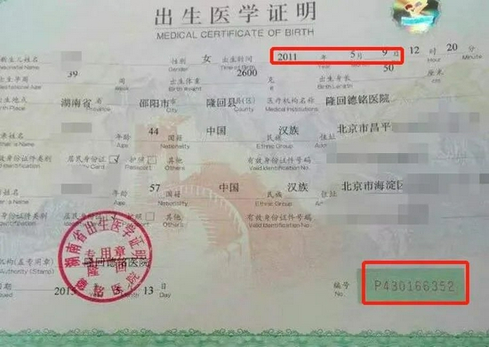 此张出生证中,证件编号首字母为P,意味着证件签发年份应该为2015年,但孩子出生年份却是2011年