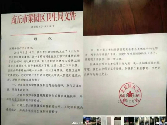 2011年2月7日,商丘市梁园去区卫生局关于出生证被盗一事的处理通报