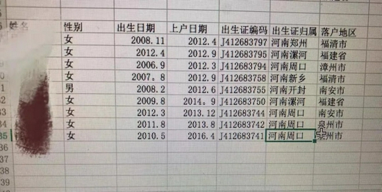 上官正义提供的9个落户于福建地区儿童信息,出生医学证明正是商丘被盗的那批,编号在J412683001-J412684000之间。连号的出生证,分别来自不同地区,上给不同时间,不同地区出生的孩子