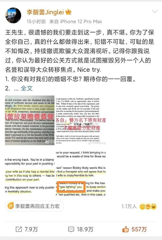 李靓蕾发布的图片内容用中文翻译为:鲍比要求这样做的另一个原因与他的行为模式有关,即用“煤气灯效应”(操纵)你…继续努力为自己辩护、证明自己,让你觉得自己“疯狂”或“不合格”等等,当然,是在这种情况下。