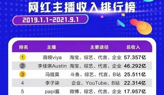 在网上流传着的一张“网红主播收入排行榜”里,薇娅、李佳琦分别以57.357亿、46.292亿元占据榜首,甩开第三名冯提莫很大的差距。