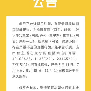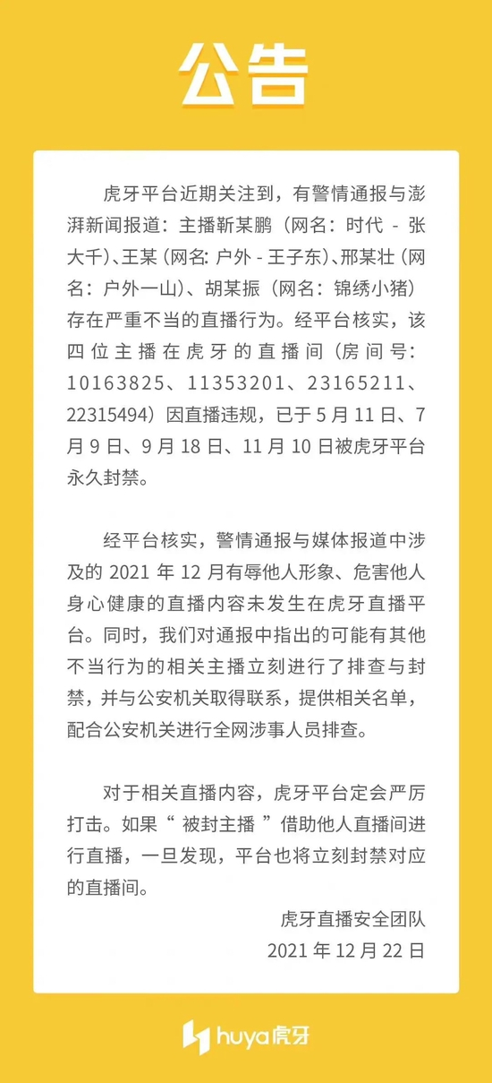 12月22日晚,虎牙直播平台的官方微博发布公告,称此前警情通报与媒体报道中涉及的 2021年12月有辱他人形象、危害他人身心健康的直播内容未发生在虎牙直播平台,涉事主播已在事发之前,就曾因违规而分别在虎牙平台被永久封禁。