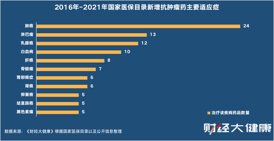 不仅是靶向药,2016年以来,国家医保目录新增肺癌用药24个,位居新增榜首。乳腺癌、肝癌等大癌种药品也相继被纳入。