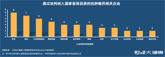 国内外药企都迫切的想要抓住医保目录大幅调整窗口期。抗肿瘤药界素有“流水的巨头,铁打的罗氏”一说,其谈判成功八个抗肿瘤药进入医保,成为数量最多的企业。