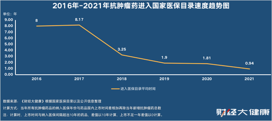 “历史欠账”基本在两年内得以解决。2019年,国家医保目录正式进入每年一次动态调整,自此新增抗肿瘤药几乎都是2017年之后获批上市的新药。抗肿瘤药从上市到进医保的速度,从2016年的平均八年,提速到平均0.94年,成为帮助创新药快速打开市场的最大助力者之一。