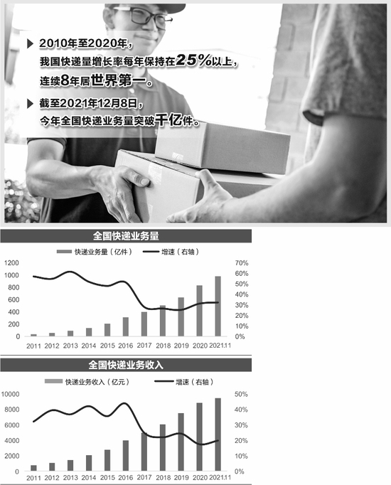 国家邮政局数据显示,自2010年至2020年,我国快递量增长率每年保持在25%以上,目前已连续8年居于世界第一。2021年,行业在件量上依旧实现高位增长,前10个月全国快递服务企业业务量累计完成867.2亿件,已超越2020年全年834亿件的水平。按照目前已突破千亿的数据,2021年增速在20%以上已板上钉钉。