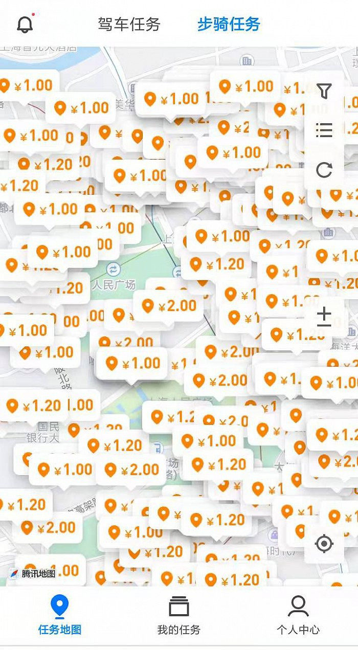 腾讯地图也在大力收集POI数据。企鹅汇图APP显示,全国各个城市均有大量的POI数据需要收集,单项任务价格1-2元。例如在上海人民广场附近,就能看到满屏的任务等待被认领(下图所示)。
