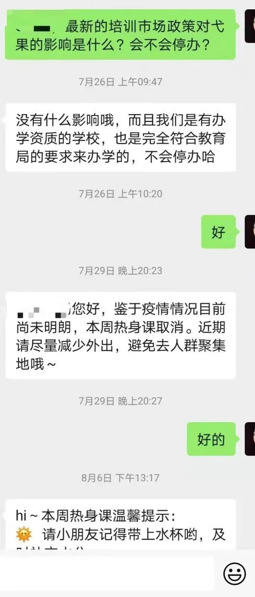 今年7月,多名家长担心弋果美语的经营状况,为此咨询了校方。校方当时的回复表示,弋果美语属于非学科类培训机构,不会受到影响。