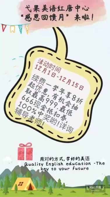 有弋果美语员工告诉《中国经济周刊》记者,在近半年的时间里,公司层面多次鼓励员工对外多招生,让家长尽快缴费。弋果美语红唐校区12月的续费活动“感恩回馈月”的宣传海报显示,续费一学年享8折起优惠,有机会抽取最高999元、最低666元现金抵扣券,100%中奖。