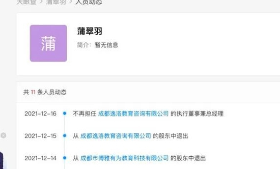 绿地468校的董事长蒲翠羽,在该校区关停的前一天和当天,相继退出成都逸洛教育咨询有限公司、成都市博雅有为教育科技有限公司的股东。此外,该校区的最大股东,成都颐果教育管理有限公司的法定代表人范志伟,在12月9日投资了成都市锦江区弋果锦华托育服务有限公司,即弋果美语锦华万达校区的托育幼儿园。12月10日不再担任该托育机构的法定代表人。
