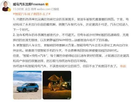 沈晖在文中称,内燃机热效率无法满足低碳社会的发展需求,是油车被取代最重要的原因。“智能+纯电+汽车”,每个属性你都得给出比油车更好的答案,才能通过历史潮流和用户体验的双重选择,然后取代传统油车的百年辉煌。传统油车和智能纯电汽车,不该是彻底对立的双方,但回不去了就是回不去了。并表示,电车有油车给不了的乐趣。