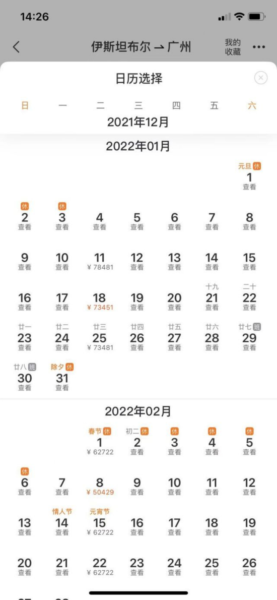 27日,记者分别查询了不同平台伊斯坦布尔飞往广州的机票价格,飞猪显示,航班数量较少,一月份机票价格为人民币7万元以上,二月份为人民币5万到6万多元不等。而携程未显示一月份机票价格,二月份同样为人民币5万到6万多元不等。