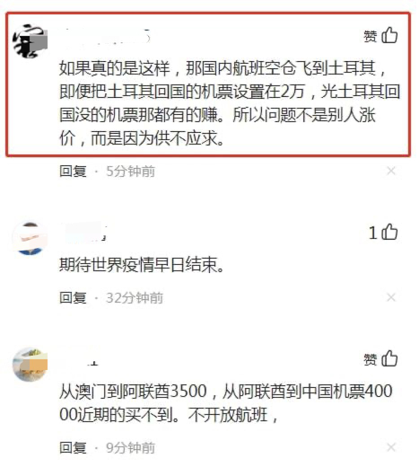 也有网友评论:如果真的是这样,那国内航班空仓飞到土耳其,即便把土耳其回国的机票设置在2万,光土耳其回国没的机票那都有的赚。所以问题不是别人涨价,而是因为供不应求。