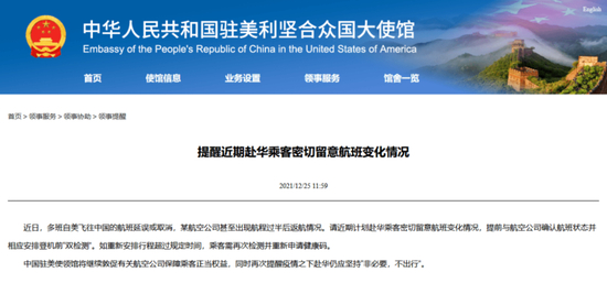 中国驻美国大使馆网站12月25日发布提醒称,近日,多班自美飞往中国的航班延误或取消,某航空公司甚至出现航程过半后返航情况。请近期计划赴华乘客密切留意航班变化情况,提前与航空公司确认航班状态并相应安排登机前“双检测”。