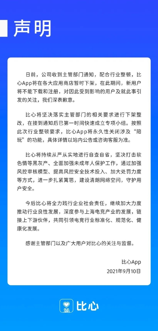 9月10日,比心APP发布声明对此事进行回应,称将“永久性关闭涉及‘陪玩’的功能”。