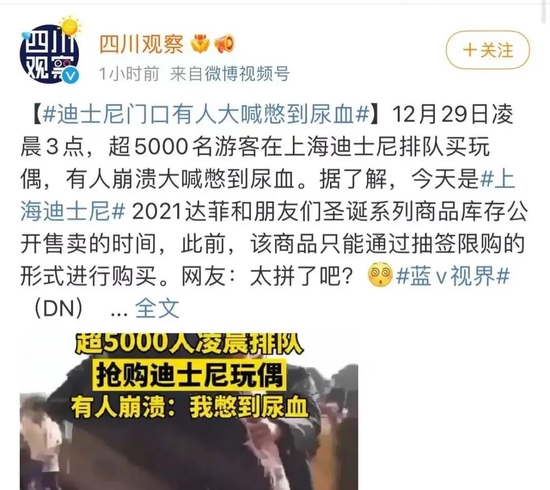 据新闻晨报报道,12月29日凌晨3点,5000多名游客在上海迪士尼门前排起了长龙。他们等待的是希望能幸运地买到“2021达菲和朋友们圣诞系列商品”剩余库存商品。