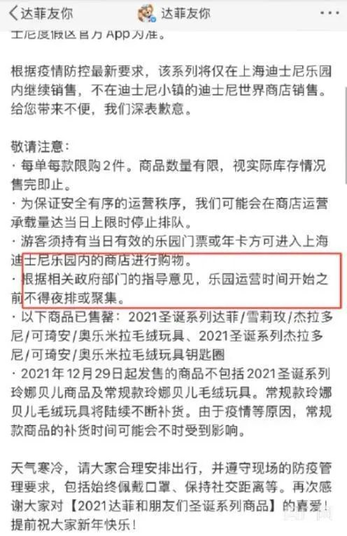 此前,在12月22日,上海迪士尼度假区官方微信公众号发布2021达菲和朋友们圣诞系列商品发售规则。本次活动采用线上抽签+线下购买的发售模式。线上报名参与抽签的截至时间为2021年12月23日23:59。