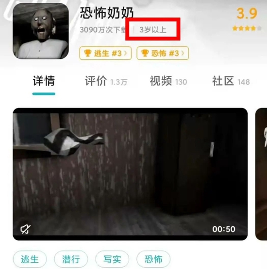 游戏首页有适龄提示,但并未找到具体说明。而一款具有恐怖元素的游戏适龄提示竟然为“3+”,对此,商店客服人员表示,是游戏厂商策划自行标注设定,平台无法干预。