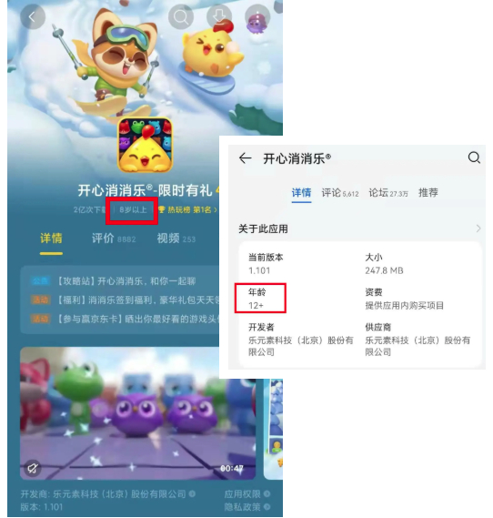 如一款开发商为“乐元素科技(北京)股份有限公司”的《开心消消乐》游戏(版本为1.101),在小米商店提示适龄等级为“8+”,华为商店提示“12+”。
