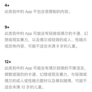 分为:“3+”7+”“12+”“16+”“18+”五个等级,有相应说明,下载界面显著位置有适龄提示。