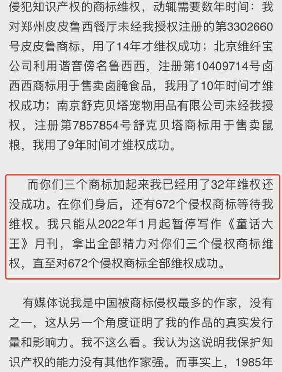 为了能集中精力“战斗”,他决定从2022年起暂停《童话大王》的撰写工作,并取消了发表500万字新作品的计划,还声称若最终维权失败,自己将停止出版所有书籍。