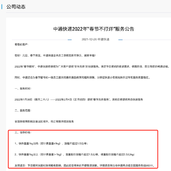 当然,随之而来的,还有春节期间运费上调的“例牌动作”。以中通为例,春节期间首重报价涨幅将不超过1.5元/单。