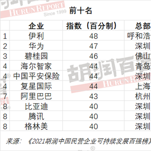 胡润中国民营企业可持续发展百强榜:伊利、华为、碧桂园位居前三