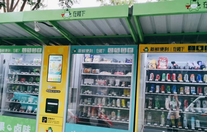 在楼下的销售形式以成组的无人售货机为主,主要设置于医院、学校以及规模较小的社区,销售包括乳制品、面包鲜食、卤味熟食、饮料、零食在内的多种商品。