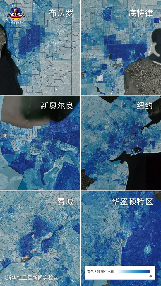 通过商业卫星影像、公开的人口普查统计、POI(地图信息点)等一系列数据,美国城市顽疾显现:无论如何扩张和变化,种族歧视带来的分裂始终存在,绝大多数黑人和其他有色人种只能一直生活在“自己的社区”。
