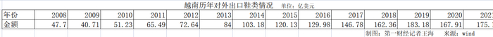 疫情前,越南的制鞋产业出口稳步攀升。Wind数据显示,该国每年对外出口的鞋类在2010年之前不足50亿美元,在2019年则达到183.18亿美元,十年翻了三倍多。