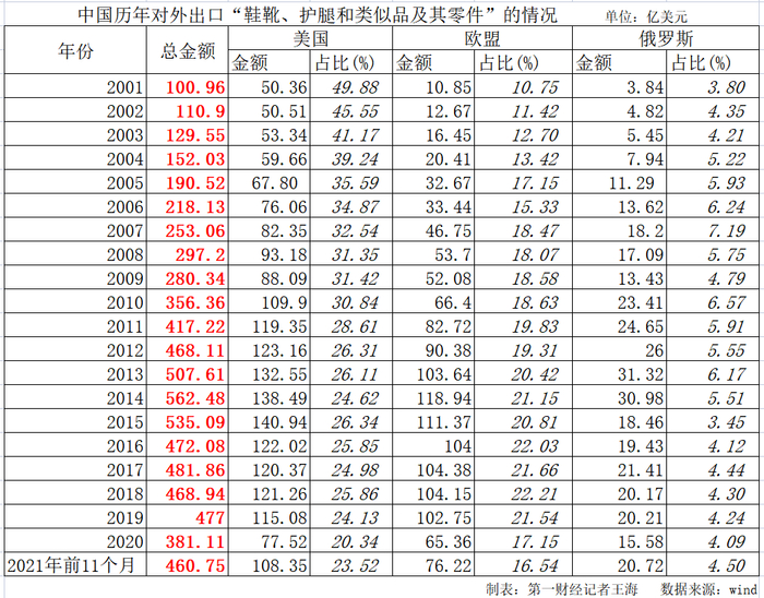 Wind数据显示,2020年,中国出口到美国、欧盟、俄罗斯的鞋靴、护腿和类似品及其零件的金额分别为77.52亿美元、65.36亿美元、15.58亿美元,占中国对外出口总额的比例分别为20.34%、17.15%、4.09%。
