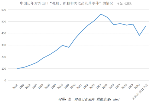 2014年,中国对外出口鞋靴的金额来到顶峰,随后开始难以阻止的回落。