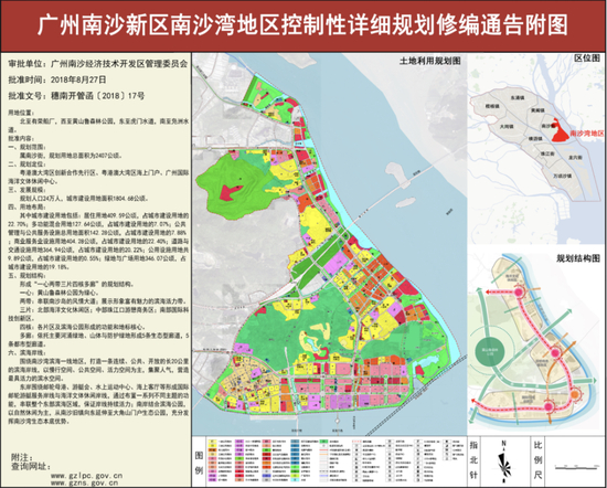 2018年广州南沙新区南沙湾地区控制性详细规划修编图册显示,该片区规划用地总面积为2407公顷(约24.07平方公里),城市建设用地面积1804.68公顷(约18.04平方公里)。
