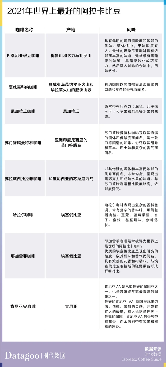 知名咖啡网站Espresso Coffee Guide综合了全球最受欢迎的咖啡、ICO、SCA 等专业咖啡网站评价、销量、消费者评价和烘焙商重复购买的数据等多种因素,给出了“2021年世界上最好的阿拉卡比豆”榜单,排名不分先后。