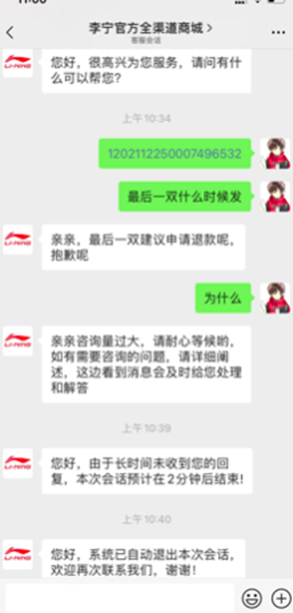 吴先生的购物体验,并不是个例。多位李宁的消费者都遇到过类似问题,且涉及小程序李宁全渠道商城、李宁天猫旗舰店、李宁官方微博、李宁app等多个线上平台。
